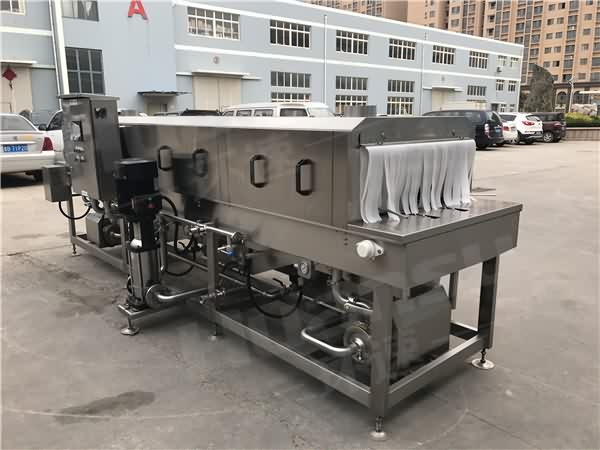 大型塑料筐清洗機清洗流程分為預洗、高壓清洗、漂洗、凈水沖洗四個階段,本機開啟后,由人工送料至噴淋清洗機鏈條軌道或由輸送連接自動進料,先進行浸泡;接著是高壓水流清洗以達到滅菌的作用;第三階段清洗水流漂洗容器表面污漬,進行再次滅菌;最后透徹沖洗,達到無菌的目的。我司自主研發的三級水箱控菌過濾系統確保循環用水無廢渣、大顆粒物質,保證清洗流暢、無堵塞。塑料筐清洗機具備權威檢測,經國外使用客戶對現場清洗后容器進行細菌檢測,清洗后容器的菌落總數<10。符合國家食品安全標準。