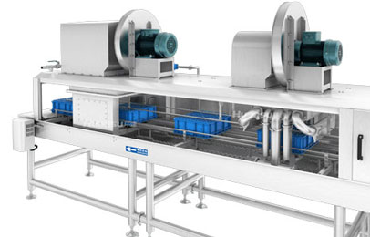 筐盤只清洗不除水,就如同上完衛生間不用手紙,流程不健全,后果就很難清爽。有道是,送佛送到西,機器洗筐盤不能止步于清洗,還需要充分除水,這是因為高潔凈度、高器具周轉需求的現代化生產線中,筐盤清洗后殘留的水本身就是一種污染物,它會改變食材原料的性狀,進而影響加工后成品的質量。食品質量不過關,吃完狂奔衛生間,萬一又忘帶手紙,妥妥成了惡性循環。為了保證筐盤滅菌去污后的清爽,環速容器滅菌清洗機在隧道末端專門設有除水段,配備了環速自主研發的風刀裝置,它同樣呈環繞式布局,且角度可調,能產生致密的高壓氣流,如庖丁解牛般剝離容器內外表面、加強筋死角、鏤空縫隙中的水分。以風干為基礎,在吸氣口配置蜂窩式加熱盤管,可吹出無孔不入的高溫氣流,將水分進一步烘干。如此雙管其下,便可確保容器油膩地來,清爽地走。